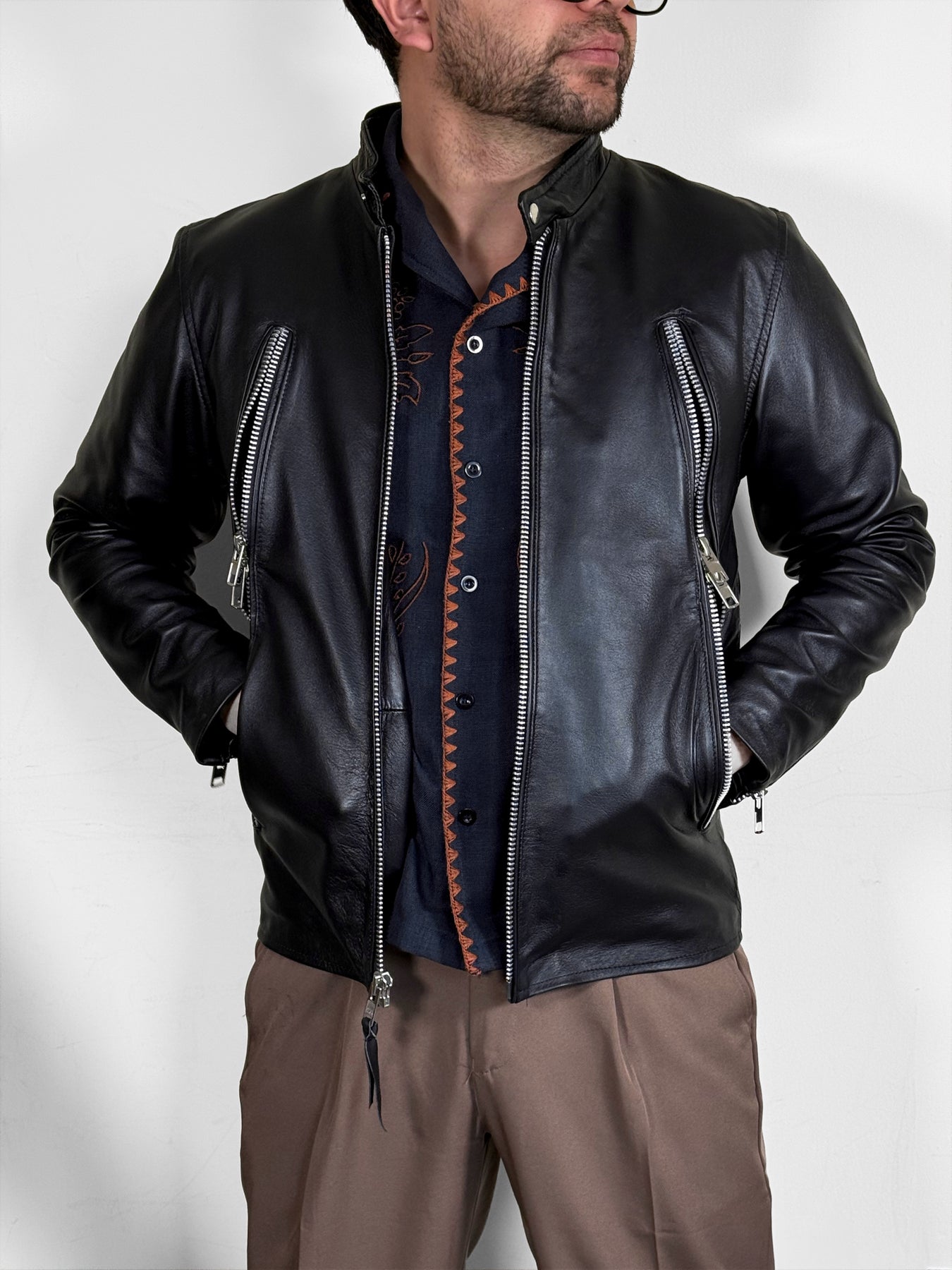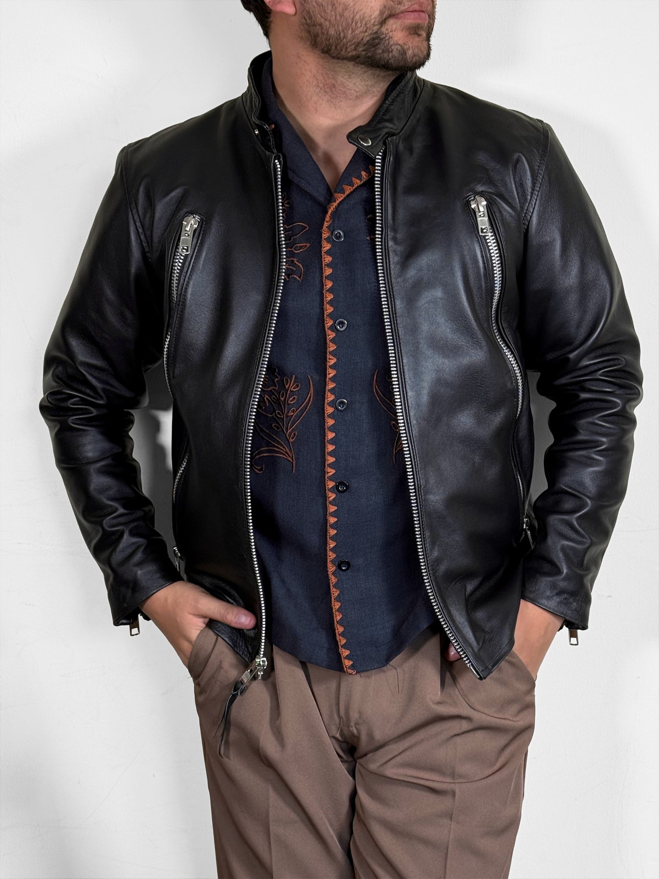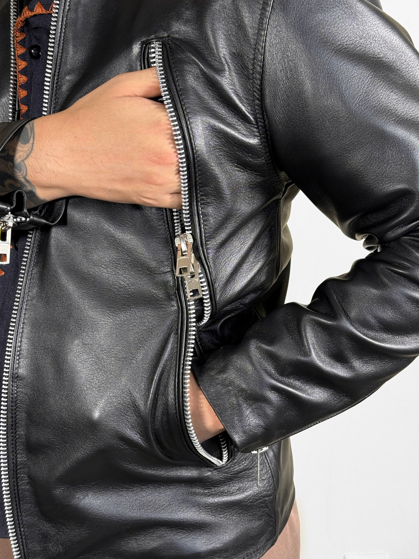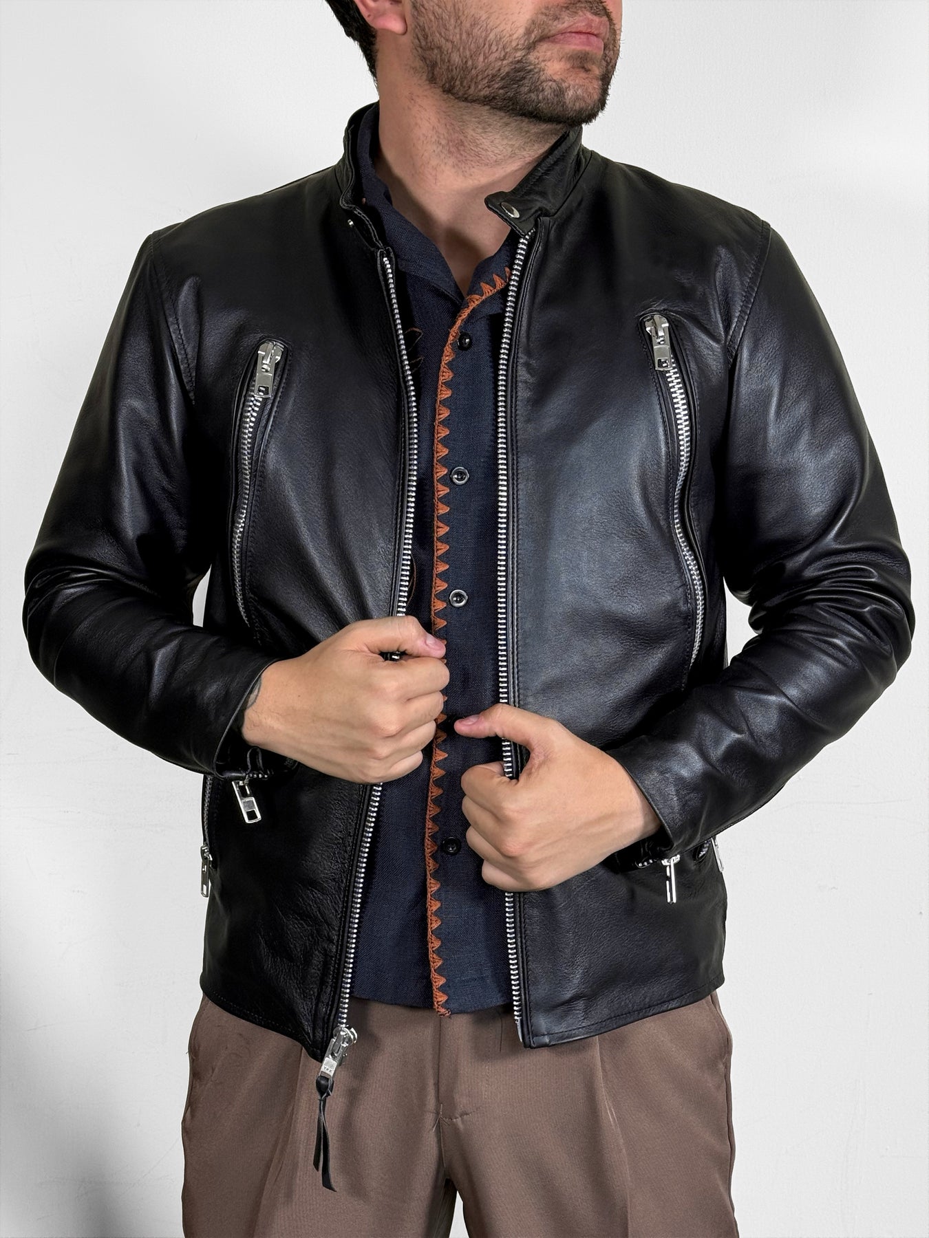 La chamarra de piel de borrego Amberes cuenta con zippers anchos y bolsillos interconectados por zippers laterales, lo que proporciona un diseño funcional y elegante. Su confección en piel de borrego asegura durabilidad y resistencia, ideal para climas fríos.