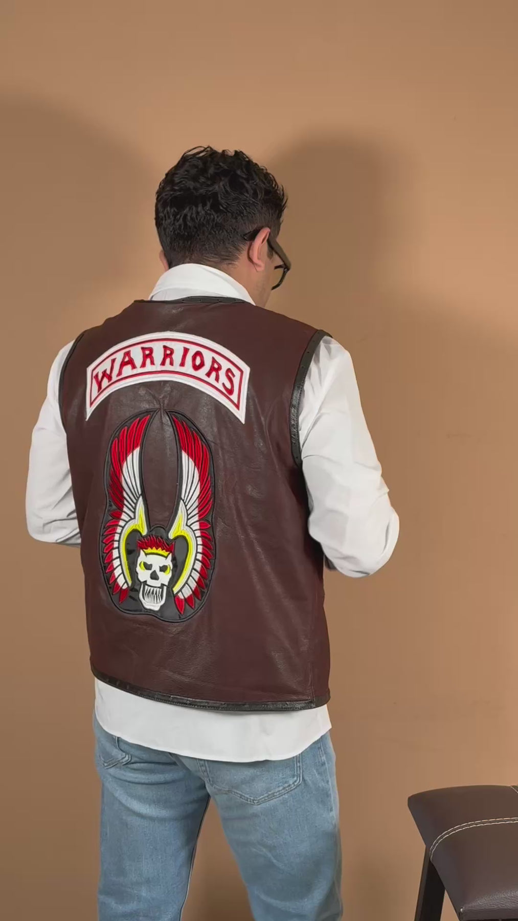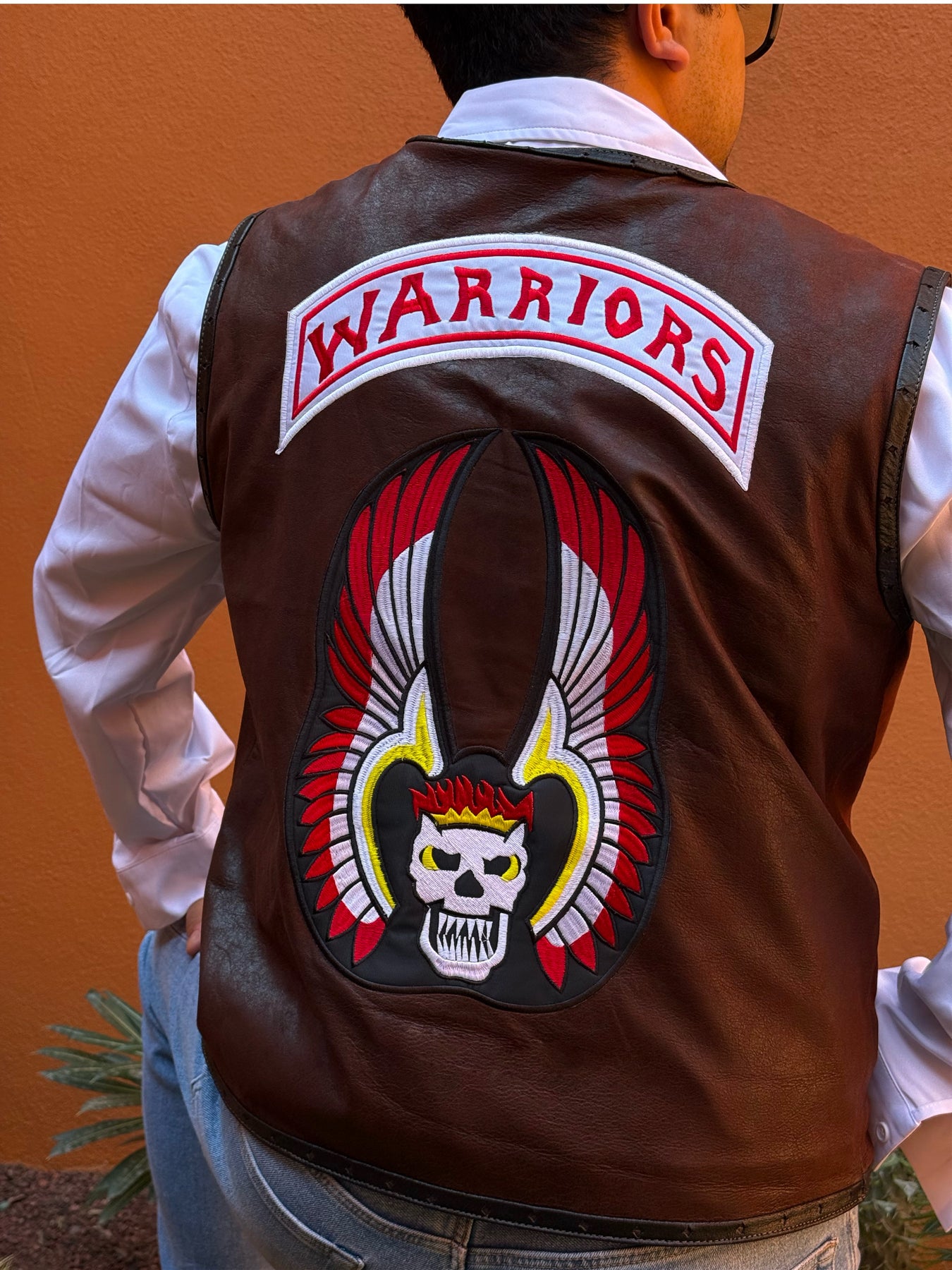 Chaleco de piel genuina inspirado en la película Warriors. Este chaleco de alta calidad está diseñado para reflejar la autenticidad de los guerreros y brindar un estilo único. Hecho con materiales duraderos, este chaleco no solo te mantendrá abrigado, sino que también te hará lucir elegante y admirable. ¡Haz una declaración con Warriors vino!